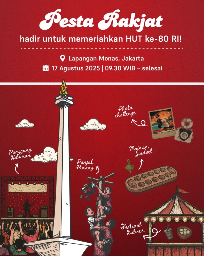 SKALAEKONOMI.COM.Jakarta, 16 Agustus 2025 – Dalam rangka menyemarakkan Hari Ulang Tahun ke-80 Republik Indonesia, Kementerian Pariwisata (Kemenpar) berkolaborasi dengan sejumlah kementerian/lembaga, pemerintah daerah, BUMN, dan swasta menyuguhkan “Pesta Rakyat” di kawasan Monas, Jalan Sudirman-Thamrin hingga wilayah Semanggi, Jakarta, yang dapat dinikmati oleh masyarakat.